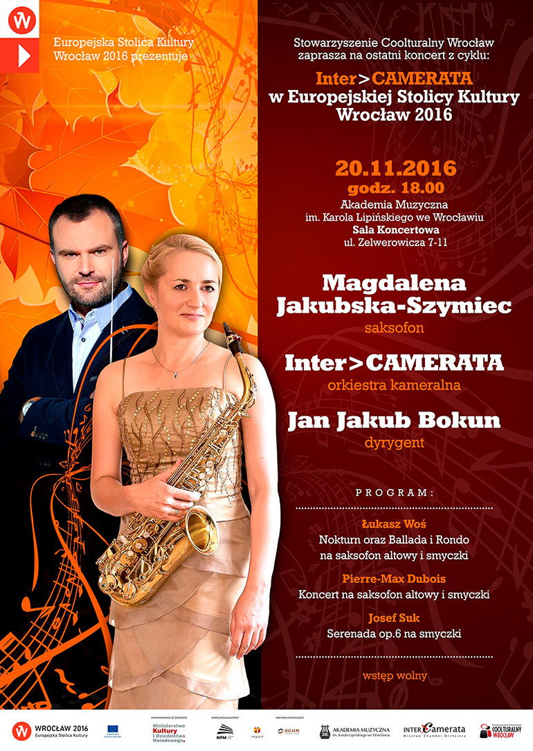 Kolejna zaskakująca odsłona znakomitej orkiestry kameralnej Inter >CAMERATA pod batutą Jana Jakuba Bokuna. Tym razem czeka nas wieczór z saksofonem w roli głównej. Do współpracy zaproszono charyzmatyczną solistkę Magdalenę Jakubską-Szymiec, profesora Akademii Muzycznej w Poznaniu.