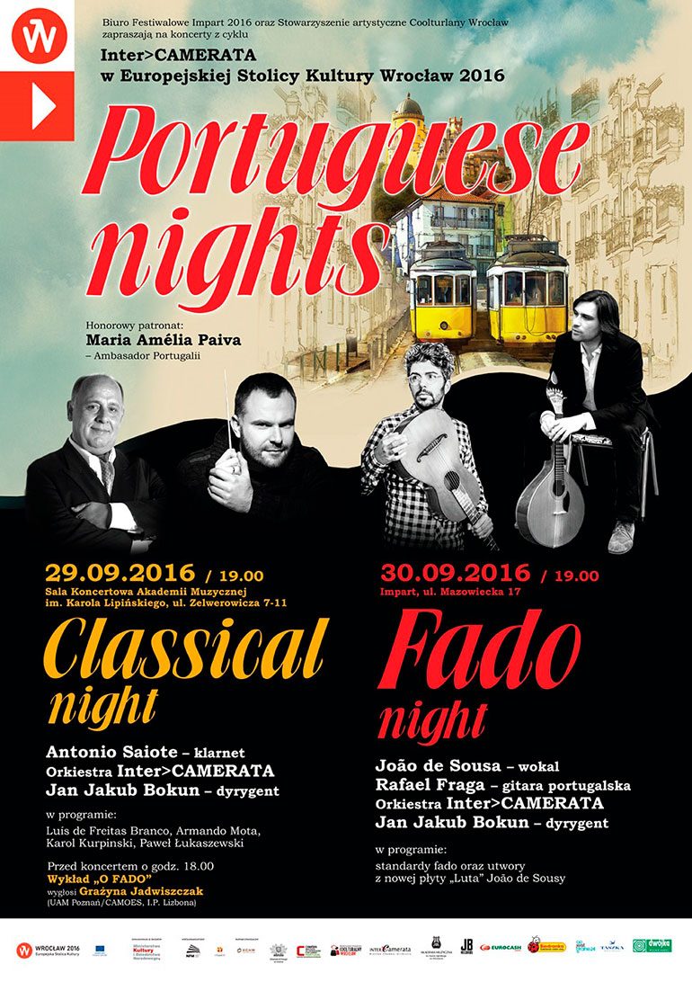 Pierwszy wieczór poświęcony będzie muzyce klasycznej. Wystąpi profesor Akademii Muzycznej w Porto – wybitny klarnecista, laureat międzynarodowych konkursów – António Saiote. Zabrzmią utwory Armanda Moty, Luísa de Freitasa Branco, a także muzyka polska – Sinfonietta Pawła Łukaszewskiego. Soliście towarzyszyć będzie orkiestra Inter>CAMERATA pod batutą swojego szefa, Jana Jakuba Bokuna. Drugi wieczór to święto muzyki fado. W wykonaniu portugalskiego wokalisty, João de Sousy wraz z jego polskim zespołem i towarzyszącą im orkiestrą, usłyszymy standardy fado oraz piosenki z najnowszej płyty artysty zatytułowanej Luta. Album powstał z inspiracji fado, muzyką luzofońską, polską, alternatywną oraz jazzem. Prawdziwą gratką koncertu będzie udział gościa specjalnego – Rafaela Fragi, który zagra na gitarze portugalskiej.
